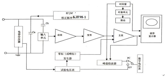 試品Ca在試驗電壓下產(chǎn)生局部放電時,放電脈沖信號經(jīng)藕合電容Ca送入輸入單元,由輸入單元拾取到脈沖信號,經(jīng)低噪聲前置放大器放大,濾波放大器選擇所需頻帶及主放大器放大(達(dá)到所需幅值與產(chǎn)生零標(biāo)志脈沖)后,在示波屏的橢圓掃描基線上產(chǎn)生可見的放電脈沖,同時也送至脈沖峰值表顯示其峰值。